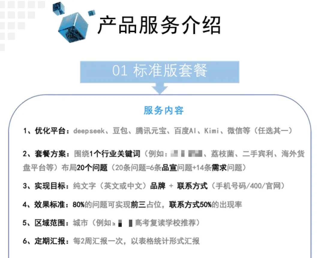 有GEO服务商还发来了报价单,报价单显示:“标准版套餐”的服务,首次服务收费为一个月2万元,或三个月5万元。其服务内容明确,可针对DeepSeek、豆包或腾讯元宝等任一AI平台,围绕一个核心行业关键词,如“高考复读”或“二手宾利”,布局20个精心设计的问题。
